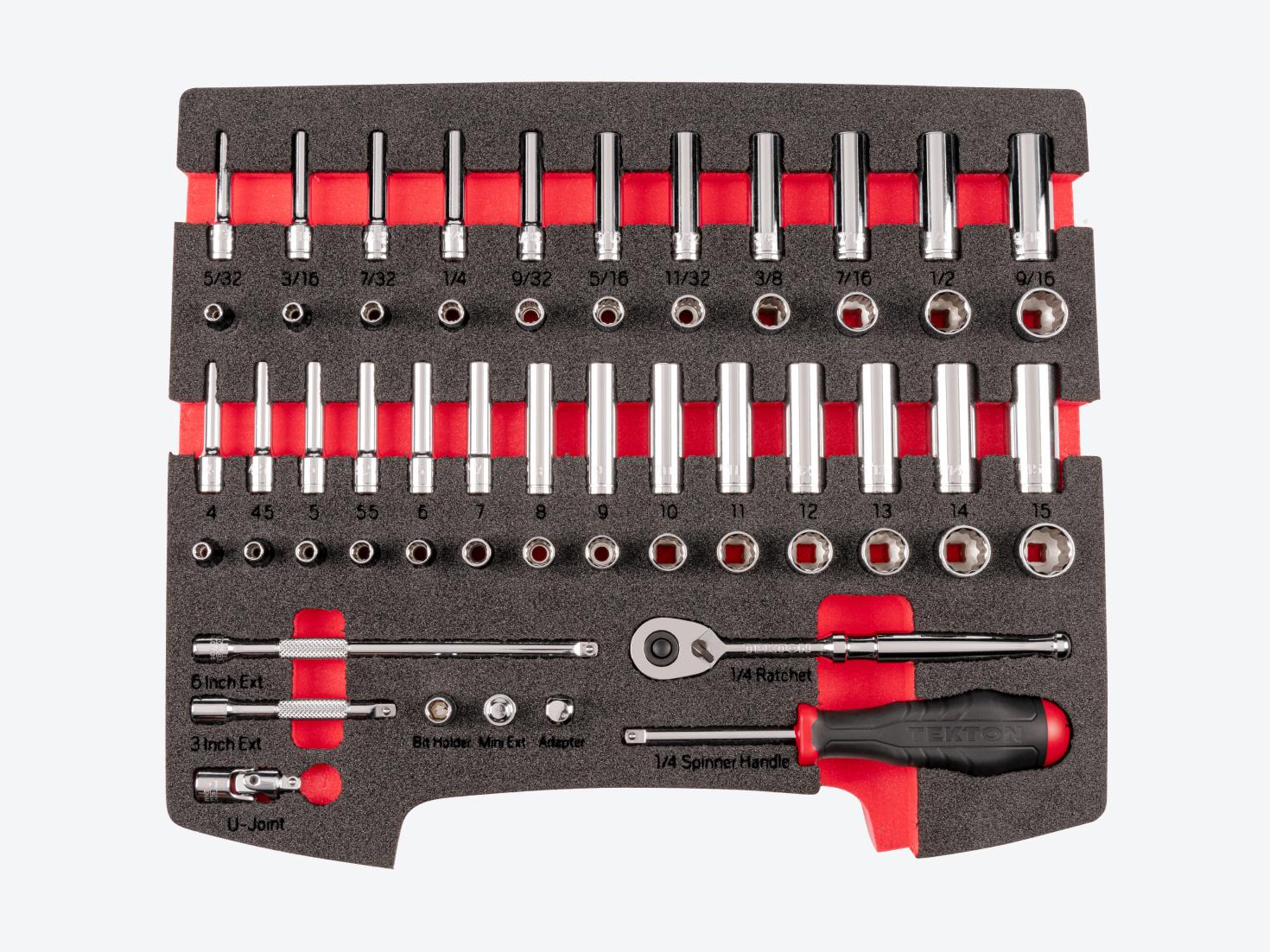 1/4 Inch Drive 12-Point Socket and Ratchet Set with Open Top Drawer and Rack, 58-Piece (5/32-9/16 in., 4-15 mm)