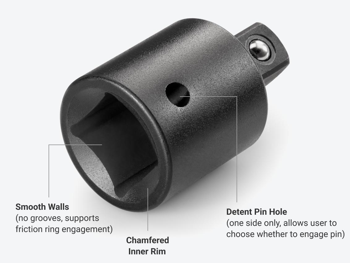 The adapters and reducers work with both friction ring and detent pin impact wrench anvils.