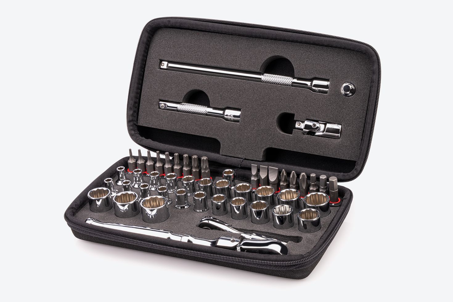 4 - 15 mm1/4 Inch Drive 12-Point Small Engine Shallow Socket, Bit, and Flex Head Non-Quick-Release Ratchet Set with Case (50-Piece)