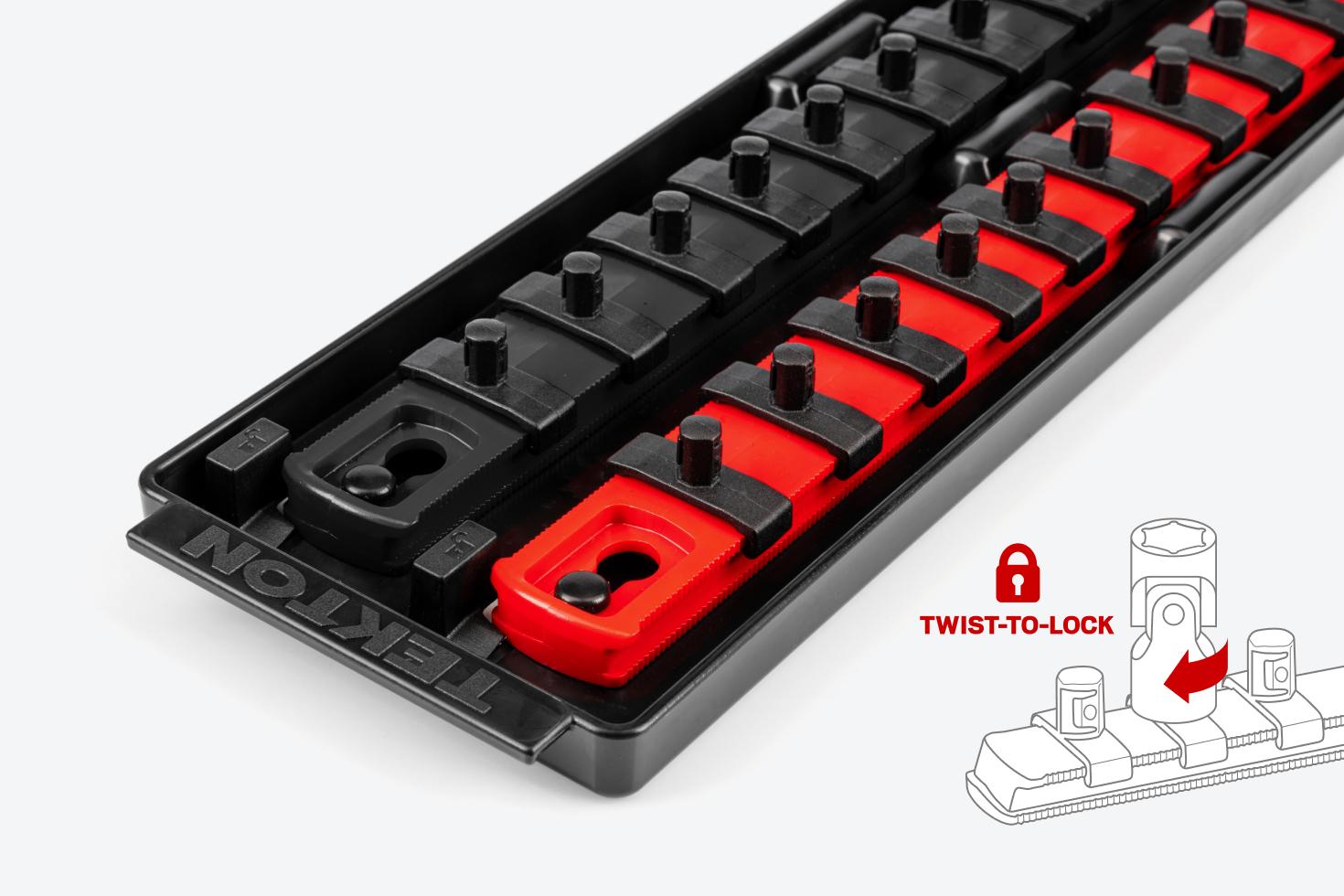 - Patented twist-to-lock design securely holds sockets on the rail