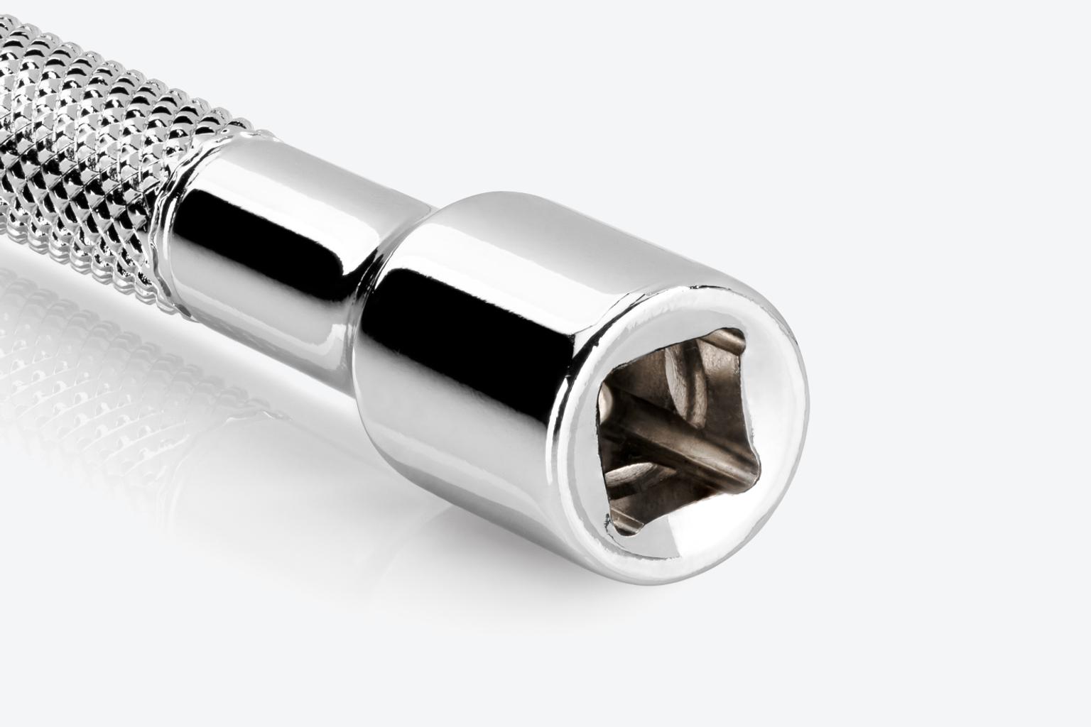 Deep knurling provides grip for turning fasteners, and grooves provide grip for attaching and removing sockets and accessories.