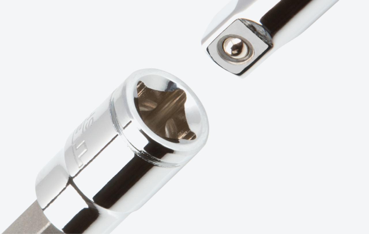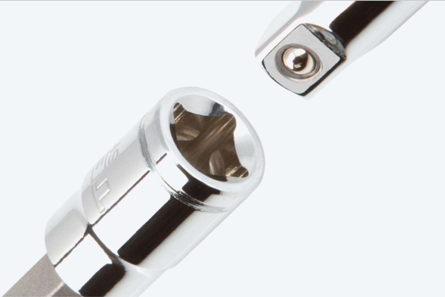 - Four detent grooves provide a secure connection with the retaining ball of a drive tool