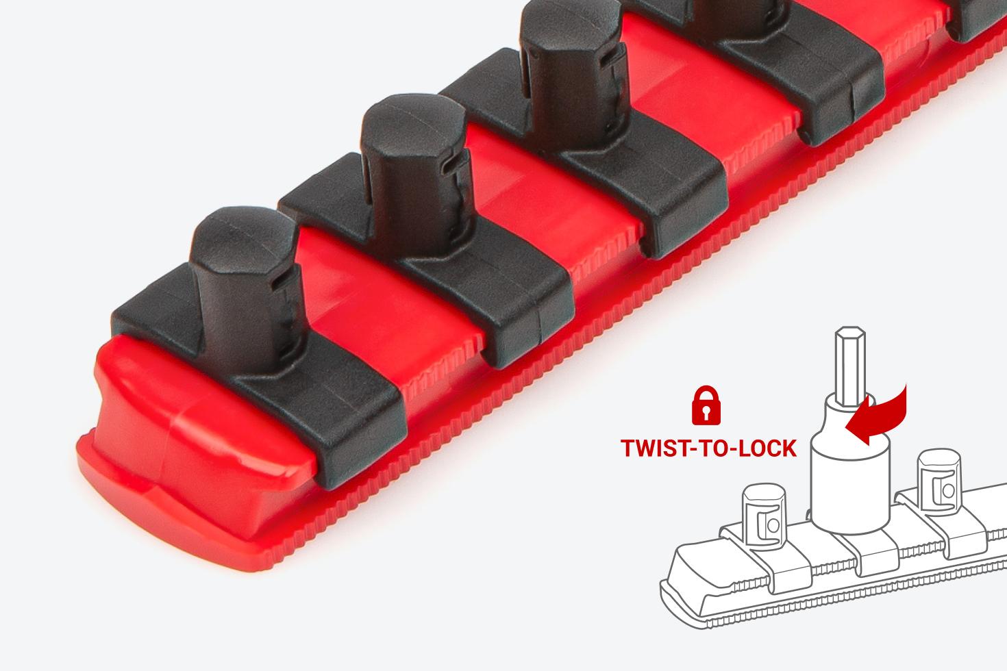 Keep your sockets organized and ready to go using the included storage rail. The twist-to-lock clips hold sockets securely and can be repositioned anywhere along the rail.