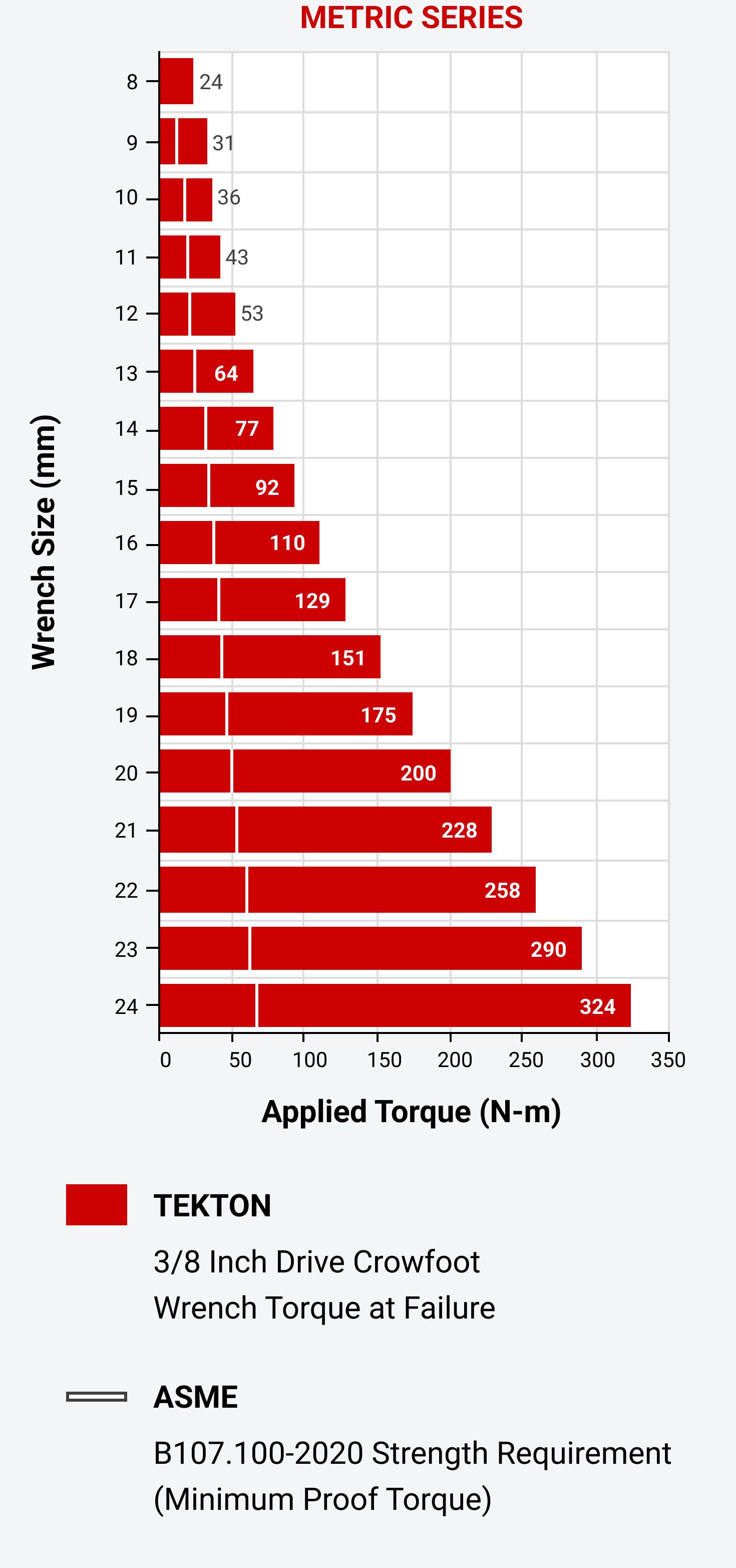 Data from: “Category 21, Type II, Class 1 Open End, 3/8 in. Square Drive.” ASME B107.100-2020. Size 8 mm does not have a standard ASME measurement.