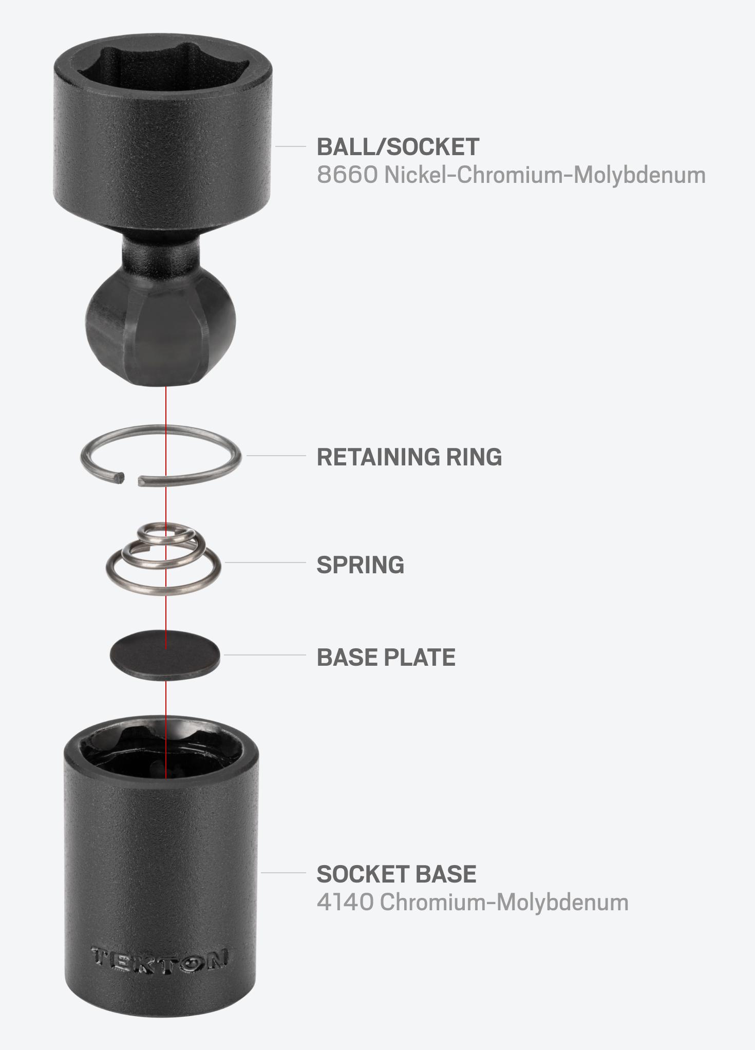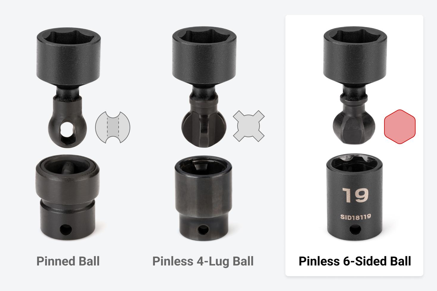 Our solid ball-and-socket-style joint is stronger than joints that use pins. The 6-sided ball operates more smoothly than 4-lug designs.