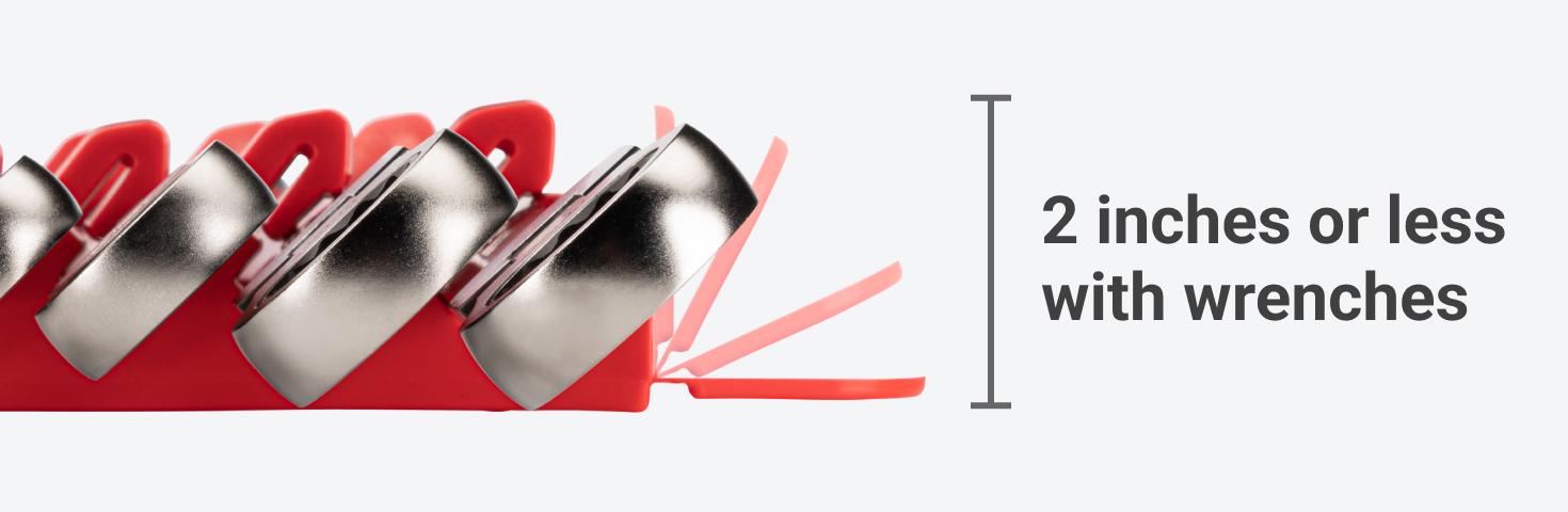 The low-profile wrench holder handle folds up and fits into shallow tool cabinet drawers.