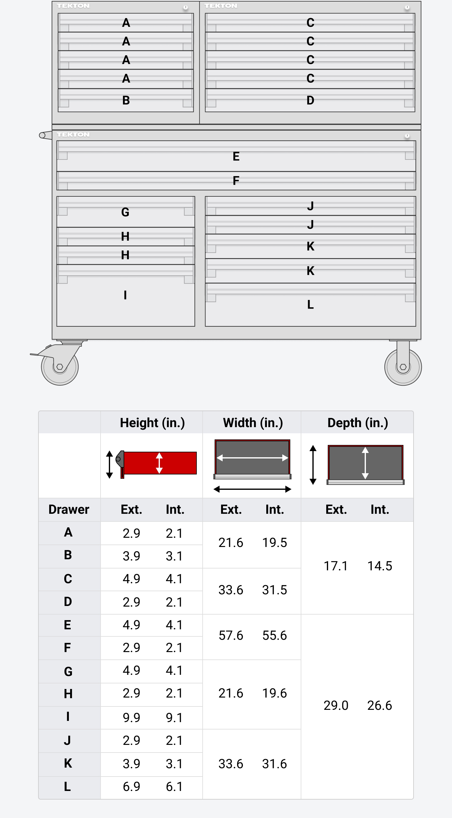 Tekton tool cabinets are finished with a glossy electrostatic powder coat, which results in a uniformly thick, durable paint layer that's resistant to corrosion and chemicals.