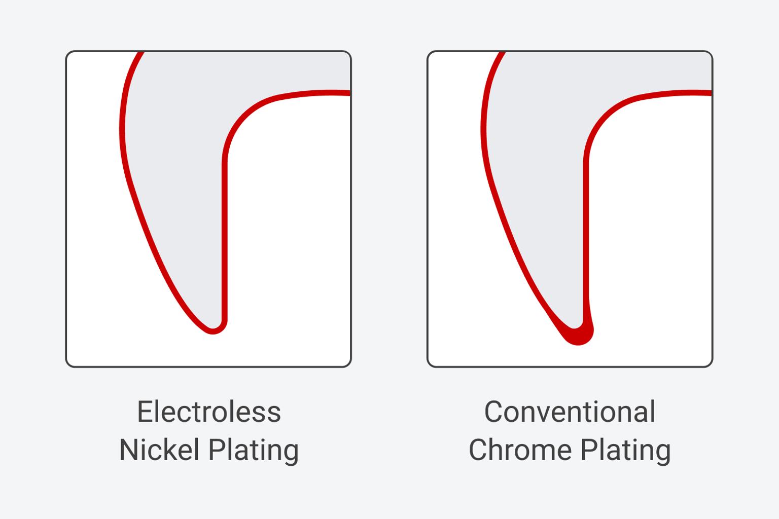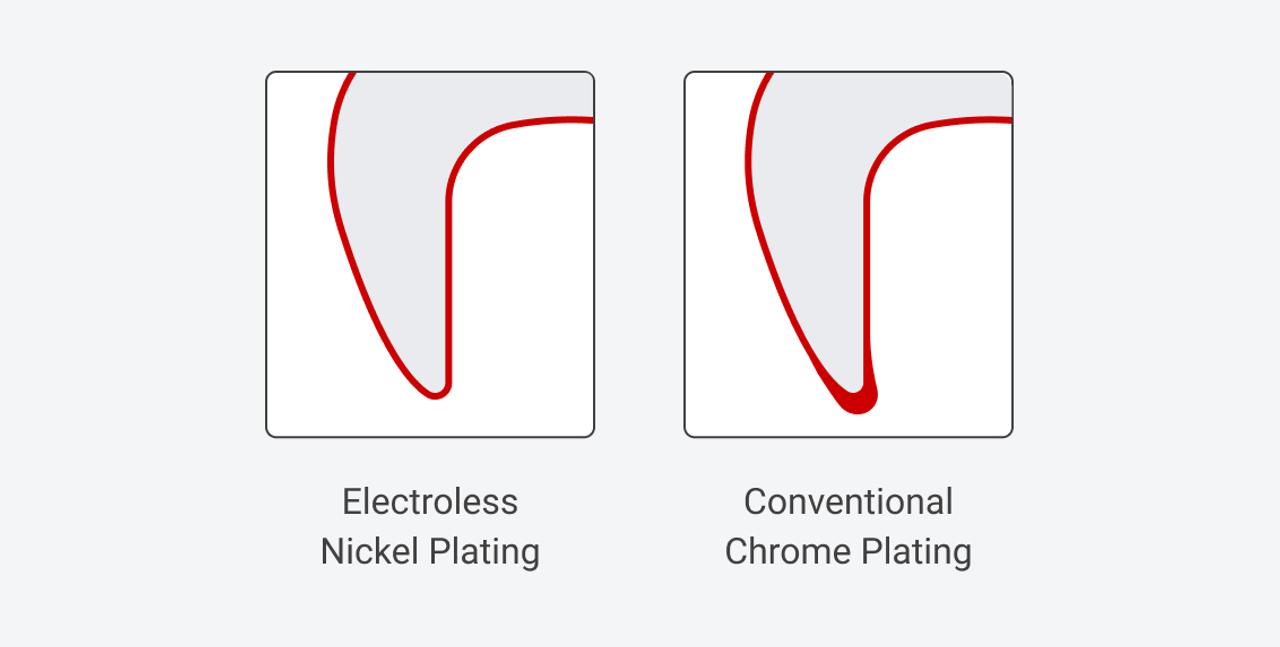 The electroless process applies a uniform coating to the entire tool surface. By comparison, electroplating, including conventional chrome plating, has varying thickness across the tool because the plating thickness depends on the electric current density at each point on the tool.