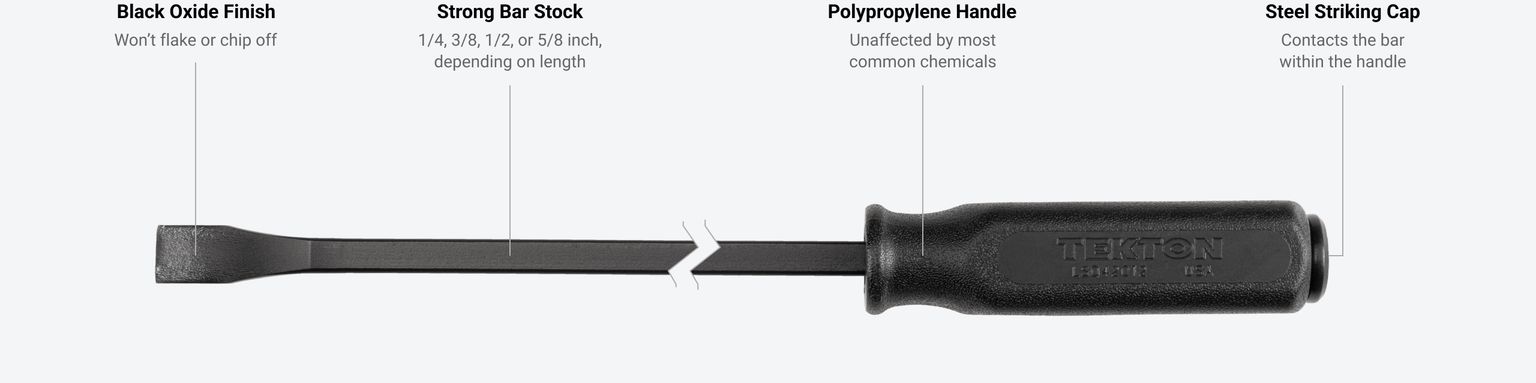 Slide in between materials or under objects with the pry bar's chisel tip, then use the angled end of the bar as a fulcrum to push apart or lift up the workpiece.