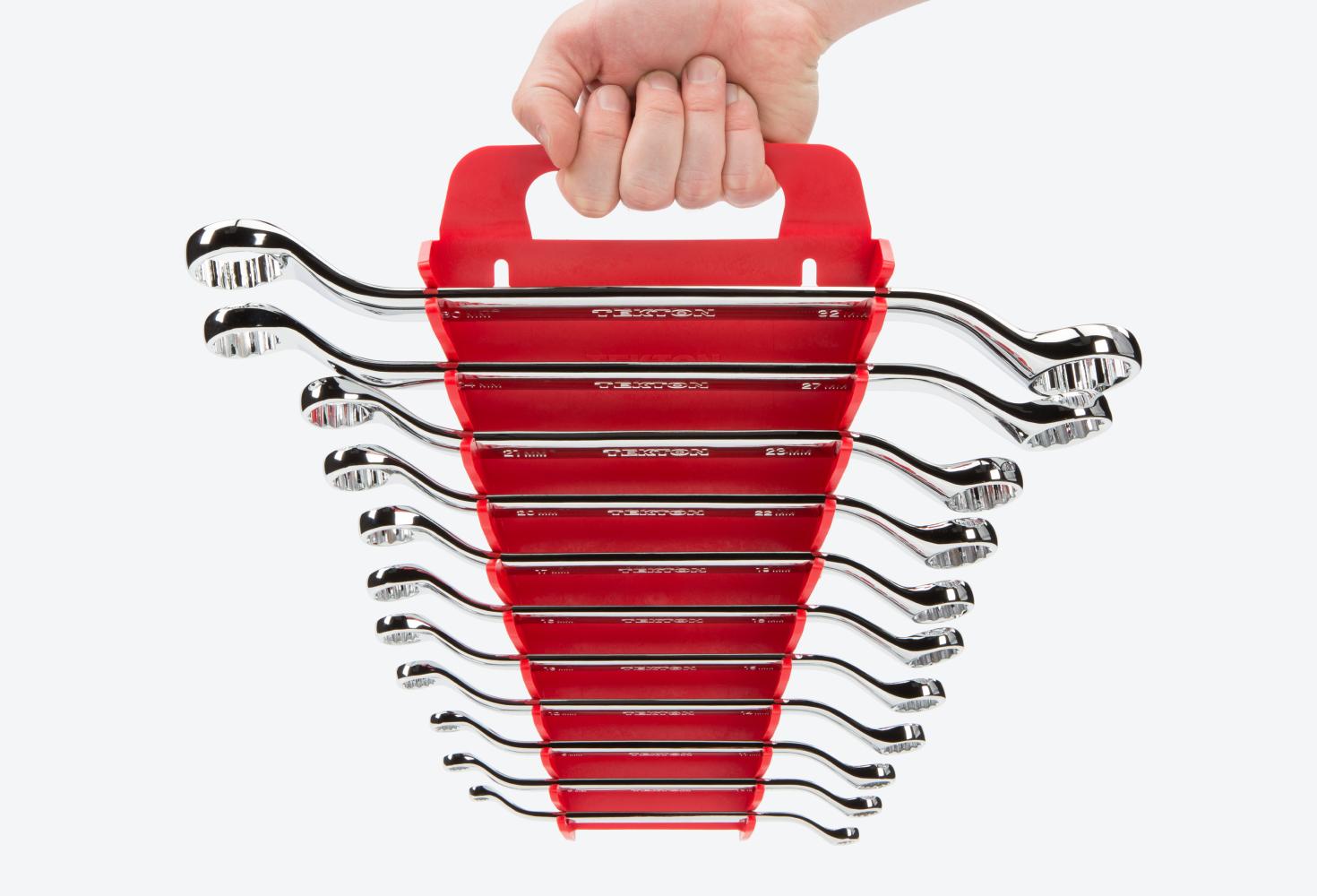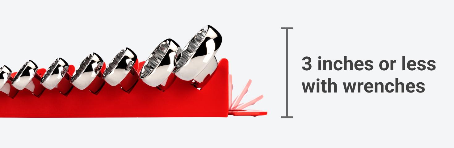 The low-profile wrench holder fits into most shallow tool cabinet drawers. The handle can be folded up to help save space.