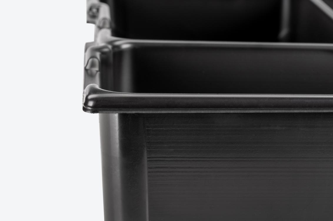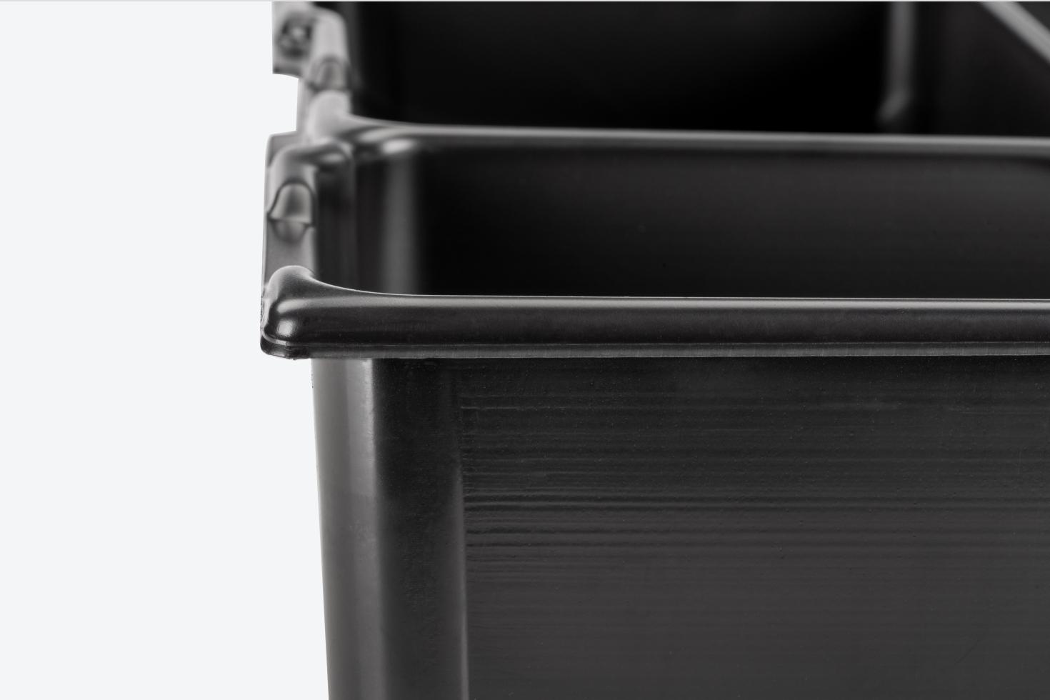 The parts trays are made of polystyrene. The lid insert is made from a closed-cell expanded polypropylene (EPP) that doesn’t absorb liquids.