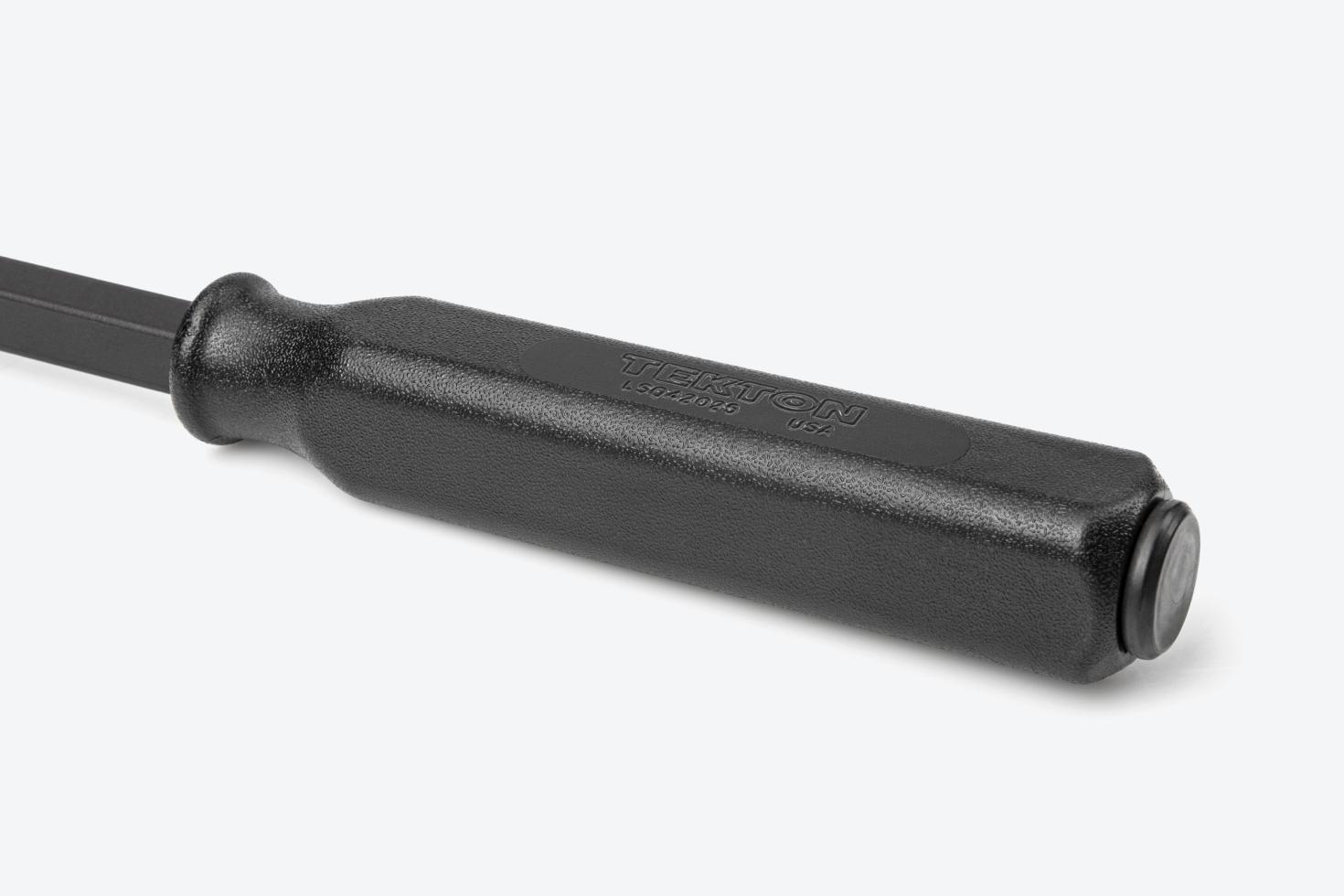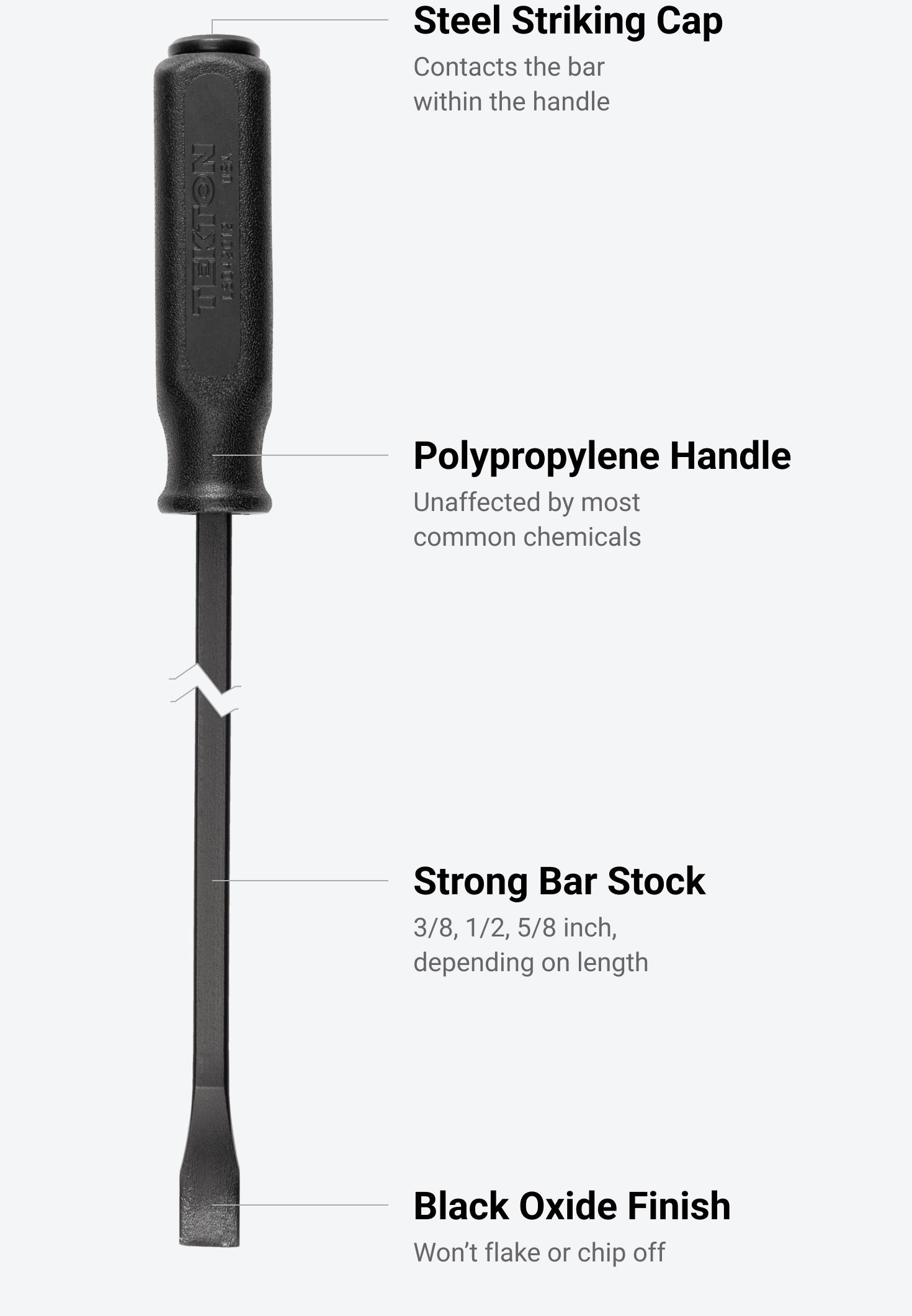 Slide in between materials or under objects with the pry bar's chisel tip, then use the angled end of the bar as a fulcrum to push apart or lift up the workpiece.