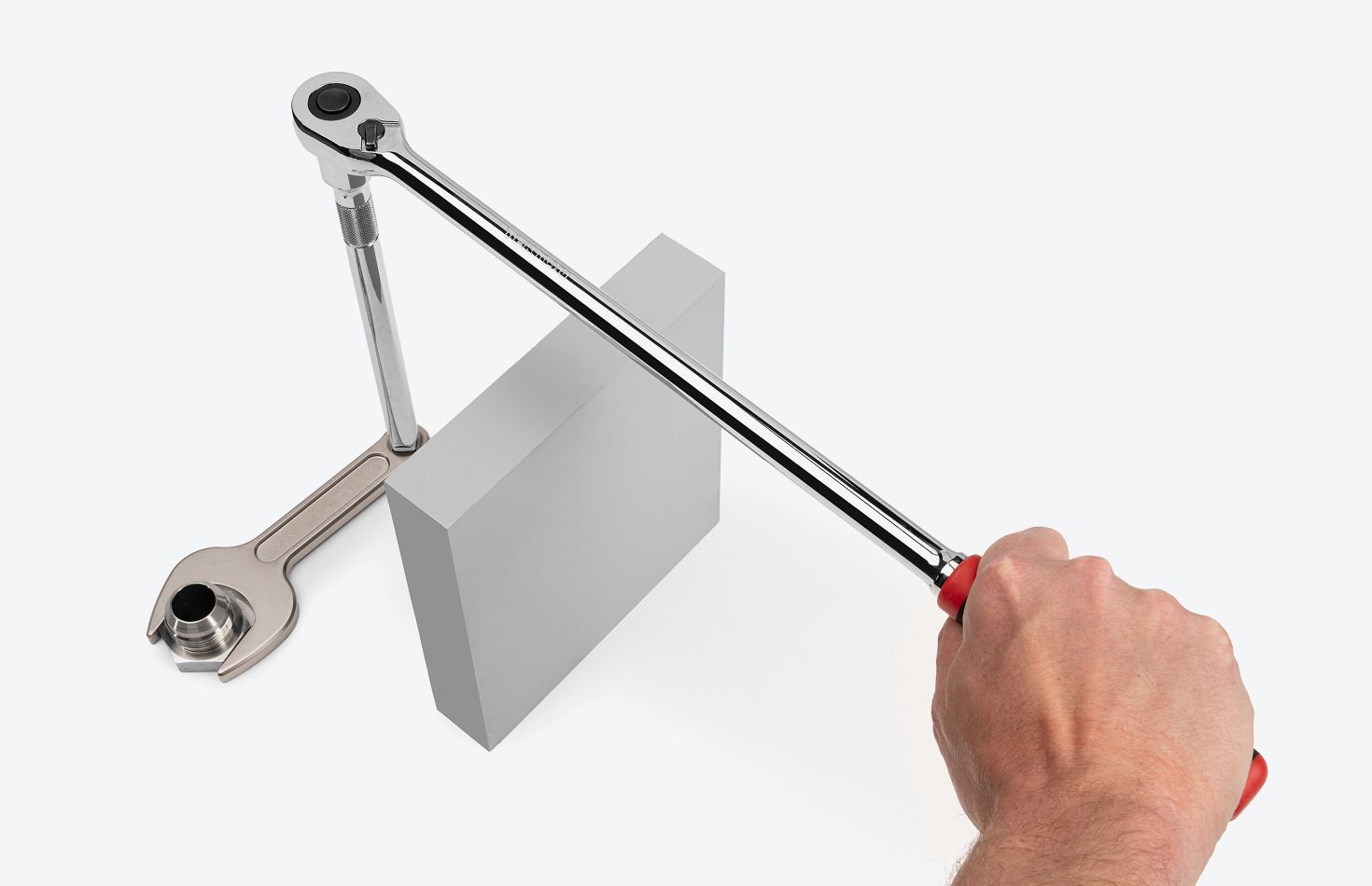 The drive square can be used with a ratchet or other drive tools to increase access or leverage and apply specific torque. Four detent grooves secure the connection.