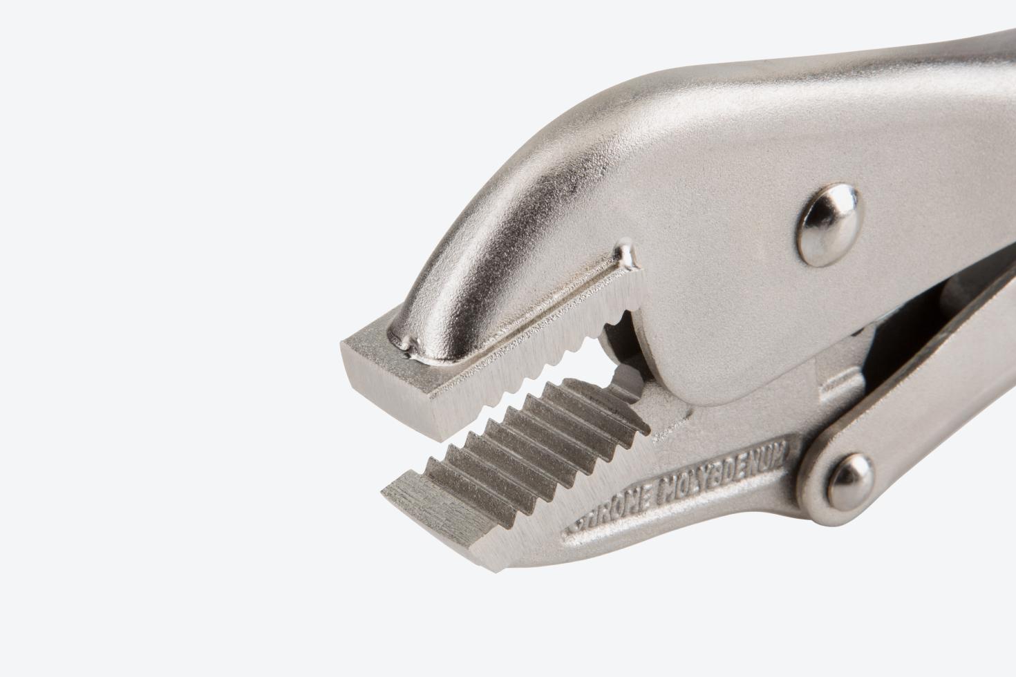 Wide and relatively short jaws clamp and hold flat stock, L-angle, and sheet metal in position for welding or assembly. Deep, sharp, regularly-spaced teeth offer an evenly distributed grip on smooth, flat surfaces.