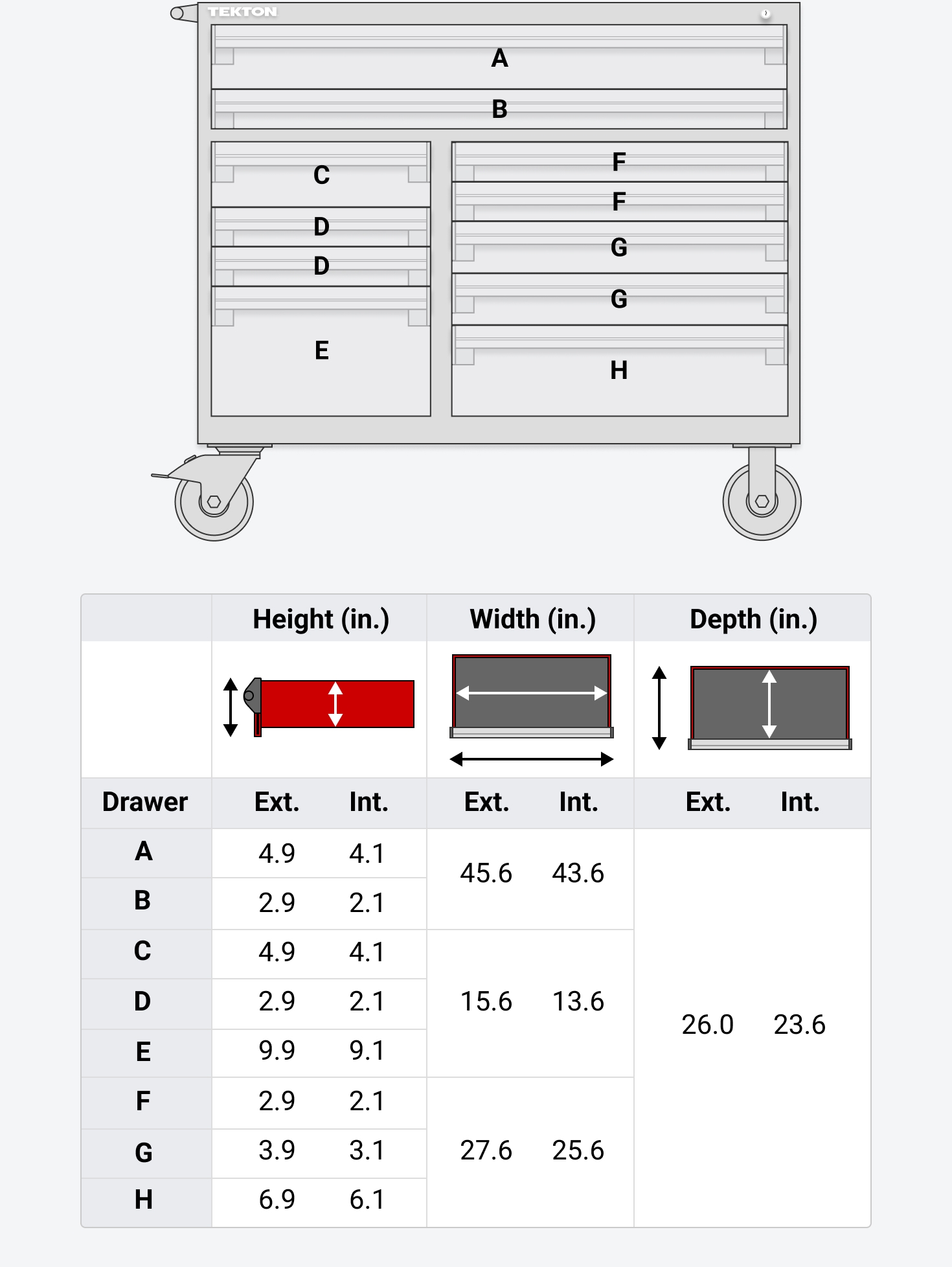 Tekton tool cabinets are finished with a glossy electrostatic powder coat, which results in a uniformly thick, durable paint layer that's resistant to corrosion and chemicals.