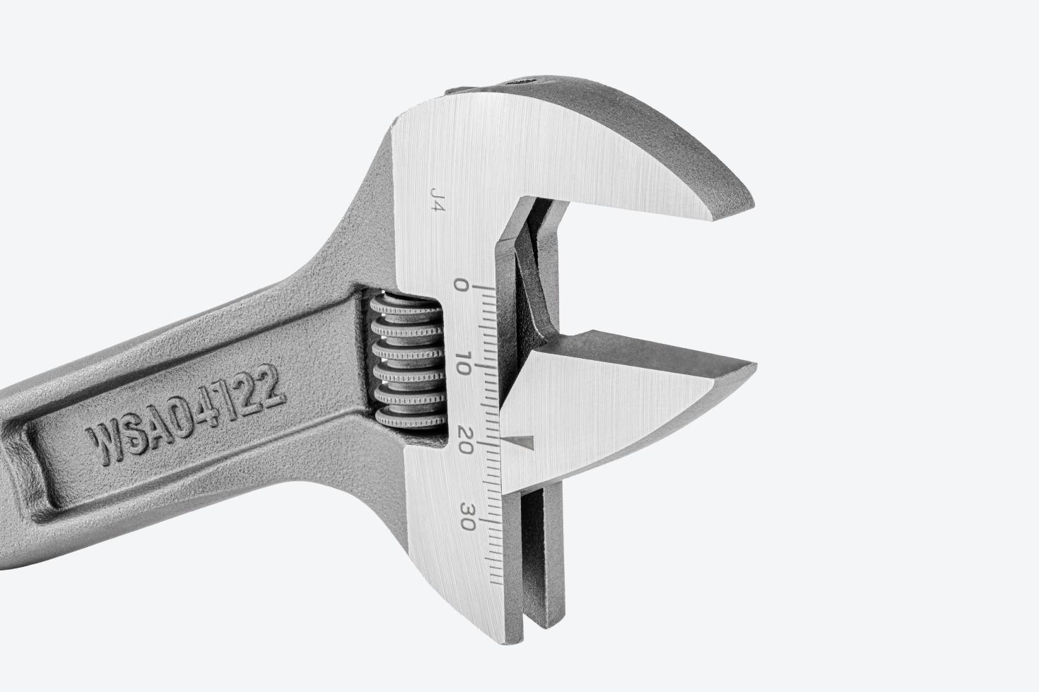Our adjustable wrench is made of 6140 chromium-vanadium steel with a zinc phosphate coating for corrosion resistance. The head of the wrench is ground smooth and has a lightly oiled surface.