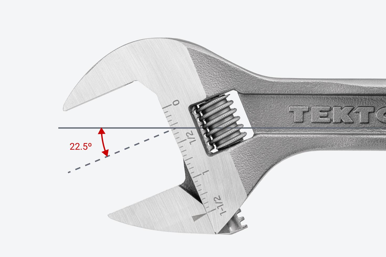 To reduce the working swing arc in tight spaces, the open end is angled 22.5 degrees so the wrench can be flipped over with each rotation to engage the fastener twice as often.