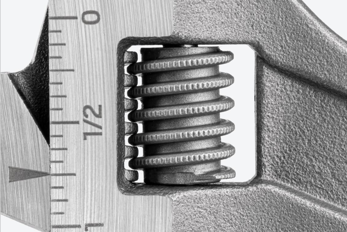 The fine pitch and tight fit between the worm gear and the teeth prevent the jaw from sliding open during use and allow for smoother, more precise adjustments.